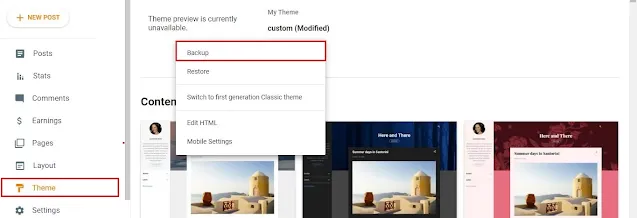 Step-2: Go to blogger website dashboard -> Click on theme section -> Click on arrow icon -> Click on backup -> Click on download Theme to backup.